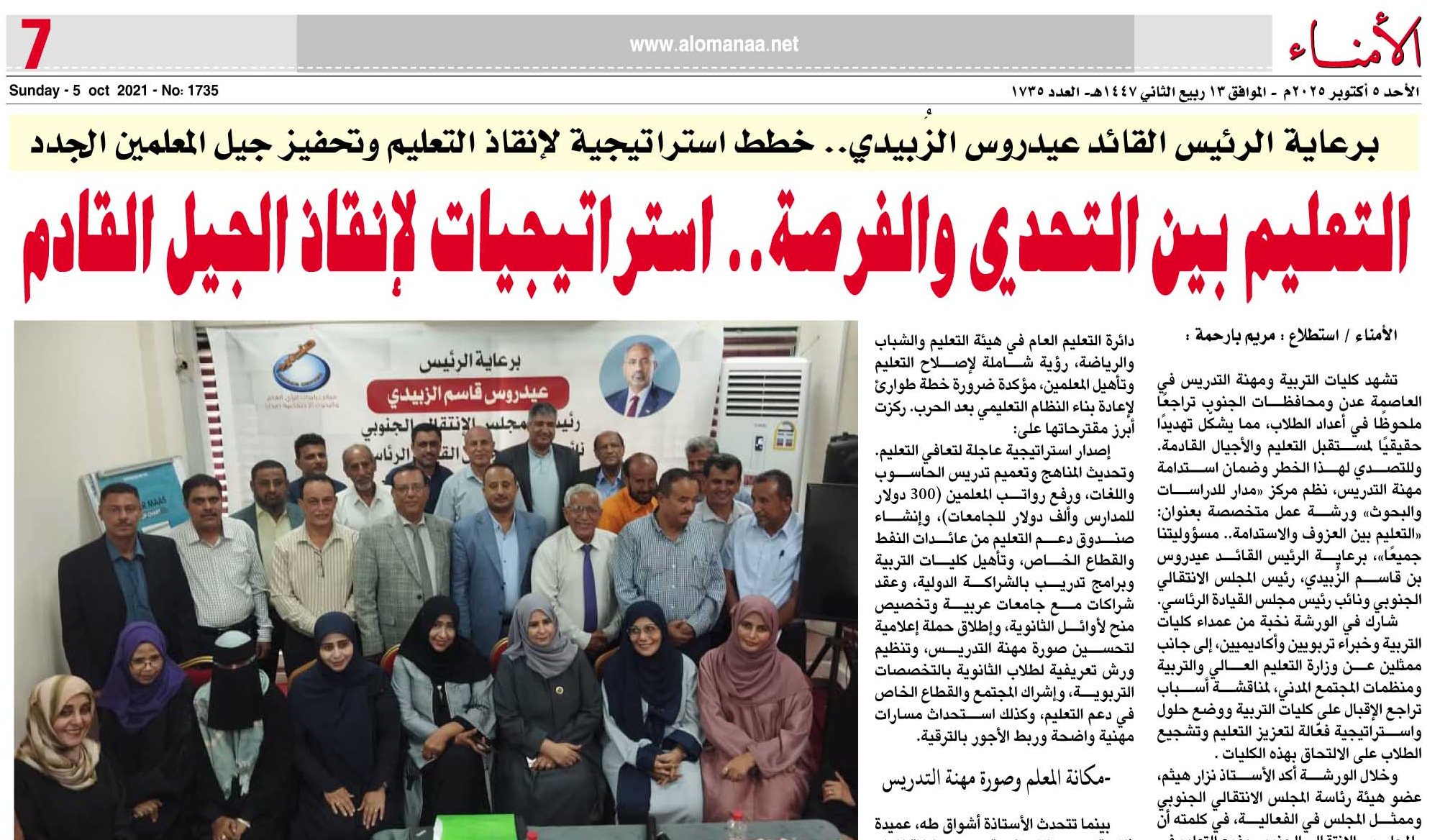 وخلال الورشة أكد الأستاذ نزار هيثم، عضو هيئة رئاسة المجلس الانتقالي الجنوبي وممثل المجلس في الفعالية، في كلمته أن "المجلس الانتقالي الجنوبي يضع التعليم في قلب مشروع بناء الدولة الجنوبية الحديثة، ويولي اهتماماً خاصاً برفع مكانة المعلم وتحسين جودة التعليم، باعتباره أساس النهضة الوطنية".