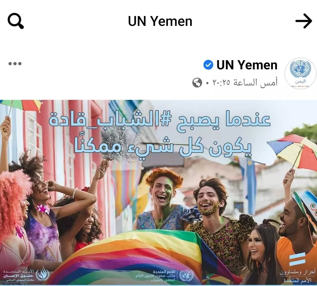 وقام مكتب الأمم المتحدة في اليمن بالترويج للشذوذ الجنسي بين الشباب في خطوة خطيرة تهدف لمسخ القيم والمبادئ لدى المجتمع.