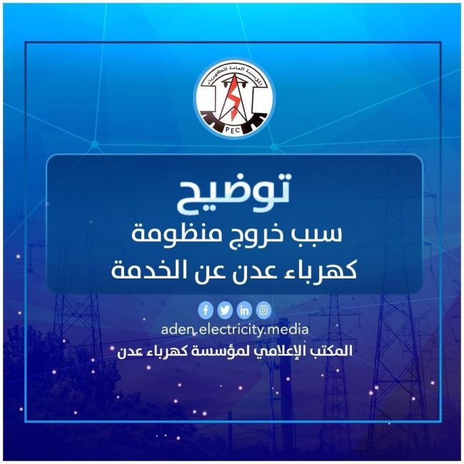 توضح المؤسسة العامة لكهرباء عدن بأن خروج المنظومة الكهربائية عن الخدمة بسبب عطب كابل نقل الطاقة الواصل بين محطتي الحسوة والمنصورة، وذلك بعد قيام إدارة مدينة "ذرة عدن" بالحفر لإمداد خدمة المياه للمدينة مما تسبب على أثره عطب كابل نقل رئيسي أدى لخروج المنظومة.