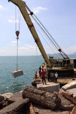 يقوم المهندسين والعمال المختصين في الإدارة الفنية حالياً بصيانة كاسر الأمواج بمنطقة رأس مربط في ميناء عدن حيث تمت خلال الاسبوع الماضي إنزال دفعة جديدة من البلوكات الخرسانية لحماية جسم الكاسر، ويأتي هذا العمل في إطار خطط مشاريع المؤسسة لإعادة تأهيل مرافق ومنشآت الميناء وتعزيز اصول وقدرات المؤسسة.