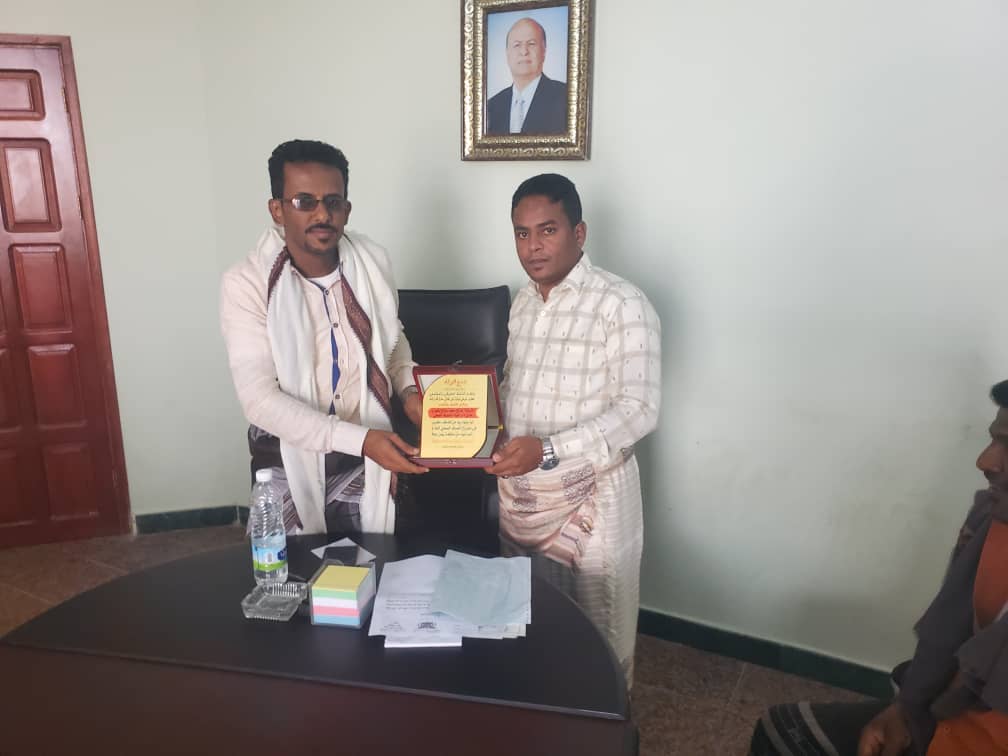 أهدى الناشط الحقوقي والمجتمعي بمحافظة أبين الأستاذ اكرم مرعي, صباح اليوم, مدير إدارة مؤسسة المياه والصرف الصحي بالمحافظة المهندس صالح بلعيدي درع الوفاء, لما يقوم به من تعاون ودعم لأهالي حارة قدر الله بمدينة جعار, من خلال تنفيذ مشروع الصرف الصحي والمدعوم من منظمة يمن عطا, عبر مؤسسة المياه.