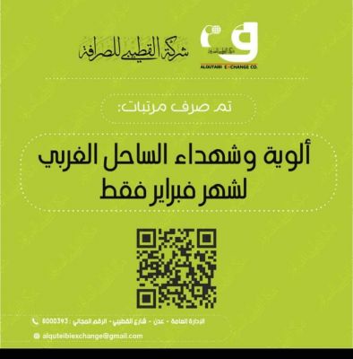 واعلنت شركة القطيبي للصرافة لجميع فروعها ببدء عملية صرف المرتبات لألوية وشهداء الساحل الغربي لشهر فبراير