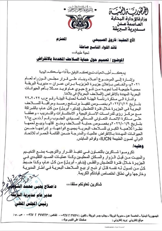 كما طالب المسؤول المحلي بتنفيذ قرارات منع الصيادين من اصطياد وقتل السلاحف البحرية في إطار مديرية البريقة وبيعها كونها من الحيوانات المهددة بالانقراض.
