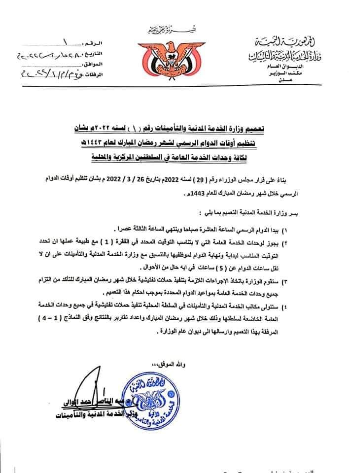 وجاء في البيان الصادر عن وزارة الخدمة المدنية أن الوزارة ومكاتبها في عموم المحافظات ستقوم بالنزول الميداني للتفتيش والرقابة على مدى الالتزام بالدوام الوظيفي ،متمنين للجميع صوما مقبولاوشهر كريم