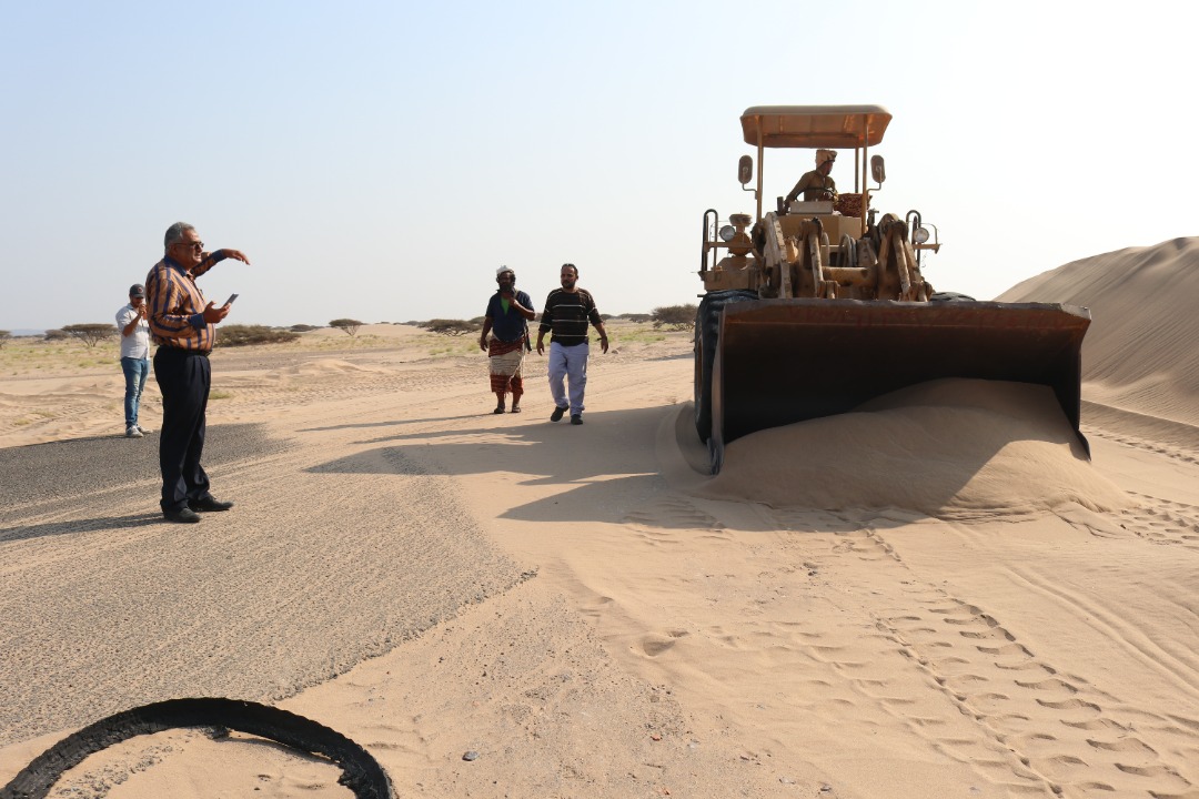 تواصل الفرق الفنية بإزاحة كثبان الرمال من خط عمران المخا الرابط بين الساحل الغربي والعاصمة عدن وذالك بتمويل ذاتي من صندوق صيانة الطرق والجسور المركز الرئيسي-العاصمة عدن.