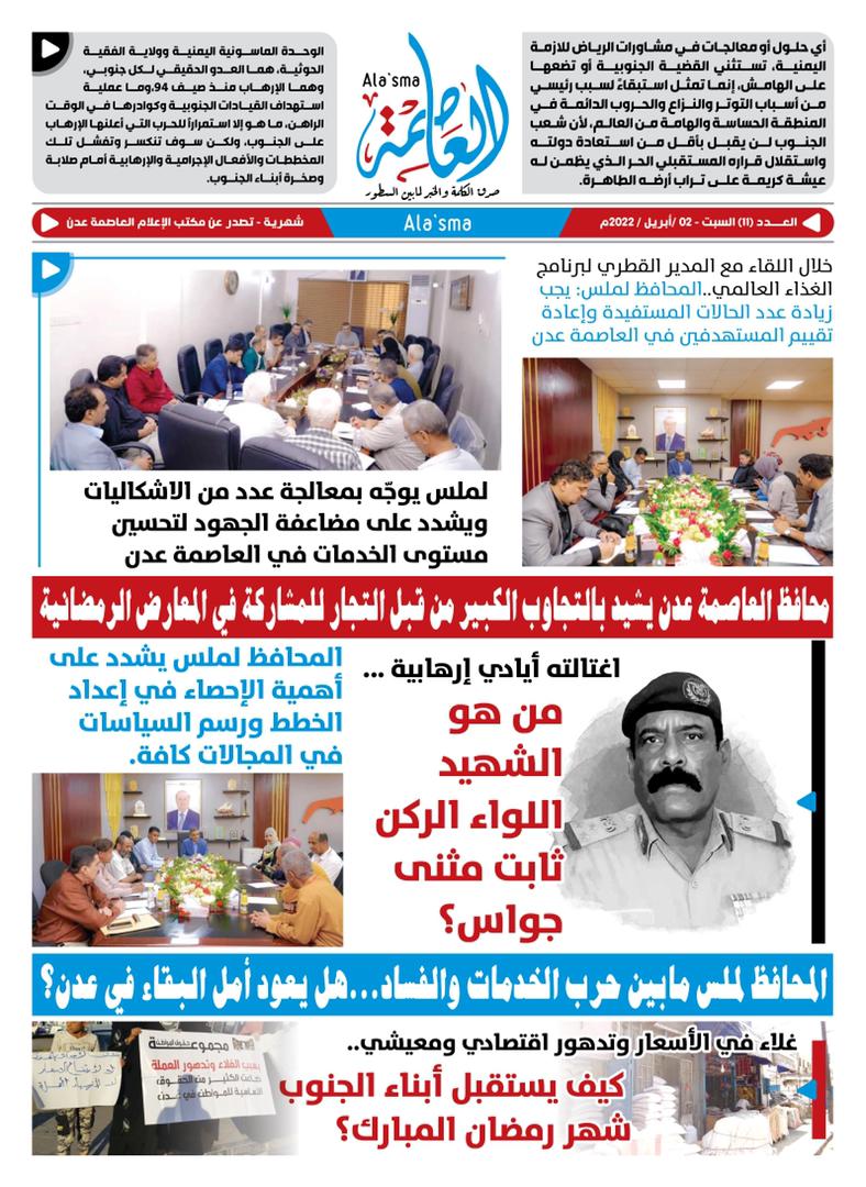 أعلنت صحيفة " العاصمة" الورقية الصادرة عن مكتب الاعلام العاصمة عدن، عن التوقف عن طباعة نسختها الورقية والإلكترونية في عددها الشهري الأخير رقم 12 بمناسبة إجازتي شهر رمضان وعيد الفطر المبارك.