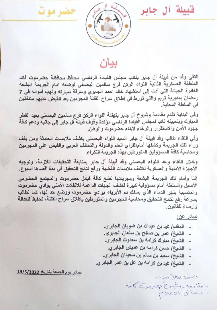 التقاء وفد قبيلة ال جابر في المكلا يوم، امس، بنائب مجلس القيادة الرئاسي محافظ محافظة حضرموت قائد المنطقة العسكرية الثانية اللواء الركن فرج سالمين البحسني وطلك للطلاع على الجريمة البشعة التي ادت الى استشهاد خالد احمد الجابري وسرقة سيارته ونهب أموالة في 7 رمضان بمديرية تريم، واصدرت قبيلة ال جابر بيان حصل الموقع على نسخه منه واليكم نص البيان :-