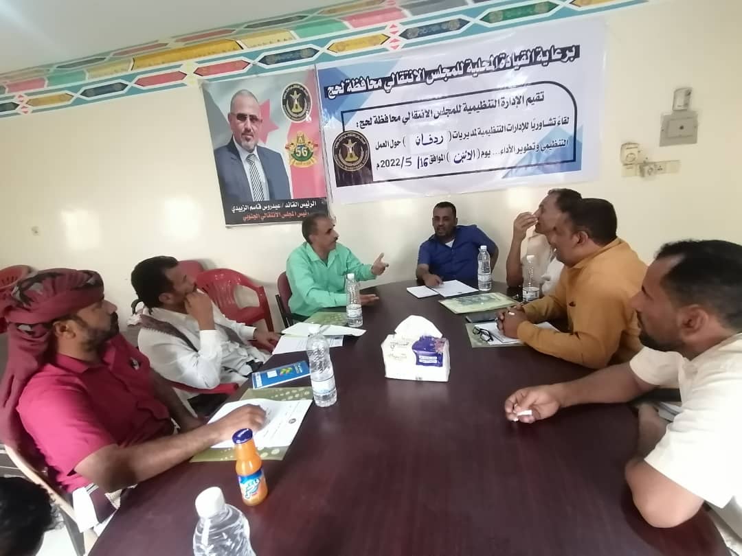 في إطار انشطتها المنفذة للفصل الثاني لعام 2022 م. وبرعاية القيادة المحلية للمجلس الانتقالي بمحافظة لحج، نظمت الادارة التنظيمية للمجلس الانتقالي في محافظة لحج صباح اليوم الاثنين 2022/5/16 م. في مقر القيادة المحلية ردفان الحبيلين، لقاءً تشاوريا، مع مدراء الادارات التنظيمية للمجلس الانتقالي، في مديريات ردفان الاربع، الحبيلين، حبيل جبر، حالمين، الملاح.