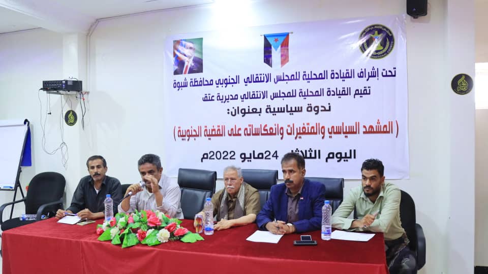 تحت إشراف القيادة المحلية للمجلس الانتقالي الجنوبي محافظة شبوة بحضور الأخ الأستاذ ناصر صالح مقلم الخليفي رئيس القيادة المحلية مديرية عتق والأخ الاستاذ سيلان حنش الباراسي نائب رئيس القيادة المحلية مديرية عتق أقامت القيادة المحلية مديرية عتق ندوة سياسية بعنوان ( المشهد السياسي والمتغيرات وانعكاساته على القضية الجنوبية ) اليوم الثلاثاء الموافق 24 . مايو 2022 م حيث تم إستضافة الدكتور علي بامخشب والدكتور فيصل البعسي لتقديم أوراق العمل في الندوة التي تركزت في ورقتين في تاريخ نضال الشغب الجنوبي منذو إنطلاق الثورة الجنوبية السلمية الي اليوم قدمها الدكتور علي بامخشب وكانت الورقة الثانية تتركز في المشهد السياسي والمتغيرات اليوم وكيفية التعامل مع ماتقتضية المرحلة السياسية مع الإستفادة من المكتسبات التي تحققت فيها قدمها الدكتور فيصل البعسي.