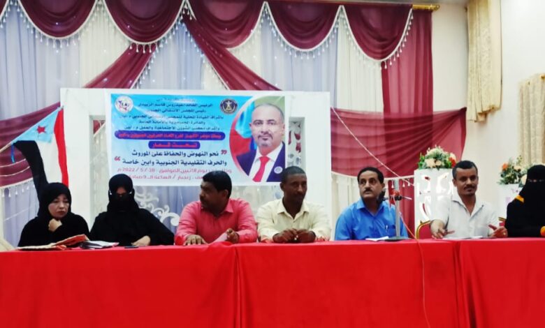 وأكد المؤتمر على أهمية الحفاظ على الحرف التقليدية للجنوب ، وأبين خاصة ، وأحياء التراث والموروث الشعبي والحفاظ عليه من الاندثار ، وفتح مراكز للتدريب في المدن والقرى ، لتأهيل المواهب في هذا المجال ، وتمكين المرأة إقتصاديا ، والعمل على تشجيع المواهب وصقلها في مجال الحرف اليدويه ، وفتح أسواق لمنتجاتهم ، لتشجيعهم على الاستمرار في العمل ، وإيجاد فرص عمل لذوي الاختصاص وتسويق منتجاتهم ، والعمل على فتح بازارات بصورة مستمرة لعرض المنتجات ، وفتح أسواق شعبية لتسويق المنتجات لاستمرار صناعة الحرف اليدويه .