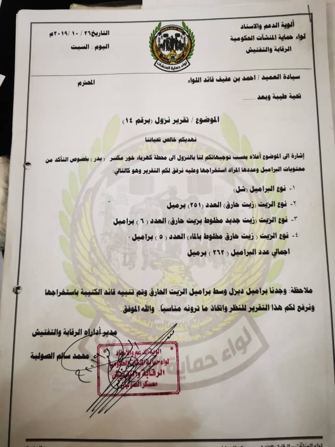 واكدت وجود براميل زيت صالح للاستخدام وبراميل ديزل بين براميل الزيت التالف وذلك لبيعها من قبل اداره كهرباء بدر حيث اكتشف فريق الرقابه والتفتيش لحرس المنشآت عملية الخلط والتظليل لسرقه وبيع زيوت صالحة للاستخدام وبراميل ديزل وذلك بحجة الزيت التالف.