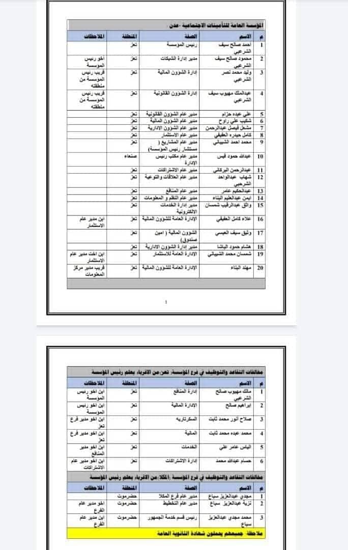 وأظهرت الوثائق المسربة عدة تعاقدات وظيفية بأسماء أشخاص وأقارب لمسؤولي المؤسسات ومدراء عموم الإدارات العامة، والذين ينتمي جلها لمحافظة تعز الشمالية.