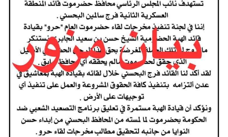 وعليه إننا في قيادة الهبة الحضرمية ننفي البيان المنشور ونؤكد بأن أي بيانات ستصدر سوف تنشر عبر لجنتنا الإعلامية وصفحاتنا الرسمية في منصات التواصل الاجتماعي.