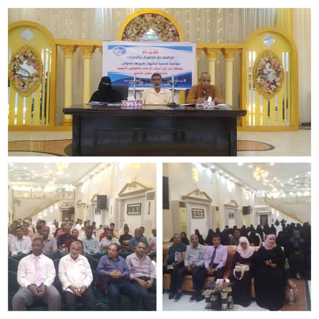 عقدت منظمة حق للحقوق والحريات صباح اليوم السبت 2 يوليو 2022 مؤتمرا صحفيا لإشهار تقريرها بعنوان : " محافظة تعز بين أنياب الإرهاب والفوضى الأمنية وانتهاكات حقوق الإنسان " في قاعة قصر مرسيليا بخورمكسر - عدن بحضور عدد من الصحفيين والإعلاميين ومنظمات مجتمع مدني والباحثين والأكاديميين والنشطاء في مجال حقوق الإنسان والتواصل الاجتماعي وممثلين عن وسائل إعلامية وممثلات لرائدات مجتمعيات وجمع من القيادات والمهتمين بقضايا الشأن العام .