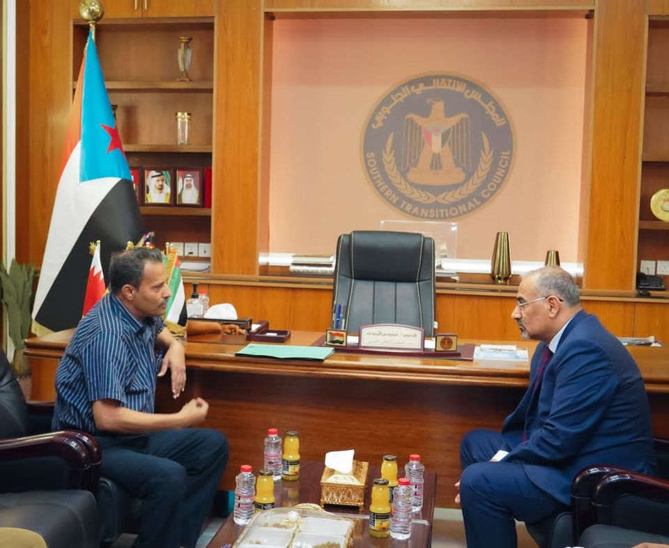 التقى الرئيس القائد عيدروس قاسم الزُبيدي رئيس المجلس الانتقالي الجنوبي، القائد الأعلى للقوات المسلحة الجنوبية، نائب رئيس مجلس القيادة الرئاسي، اليوم الثلاثاء، محافظ محافظة أبين اللواء أبوبكر حسين سالم.