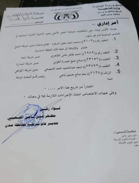 أصدر مدير عام شرطة العاصمة عدن اللواء الركن مطهر علي ناجي الشعيبي أمراً إداريا قضى بتكليفات إدارية في أقسام الشرط في العاصمة عدن وذلك استناداً إلى الصلاحيات المخولة اليه وللارتقاء بالعمل الأمني في العاصمة.