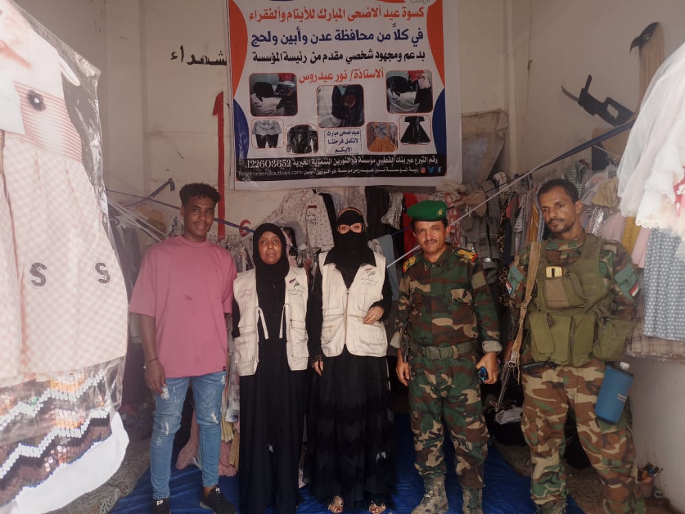 في مبادرة طيبه قامت مؤسسة ذو النورين الخيرية التنموية بتوفير كسوة عيد ألاضحى المبارك للأيتام وألفقراء كبار وصغار بدعم ومجهود شخصي وأهداء و من رئيسة المؤسسة الأستاذة نور عيدروس.