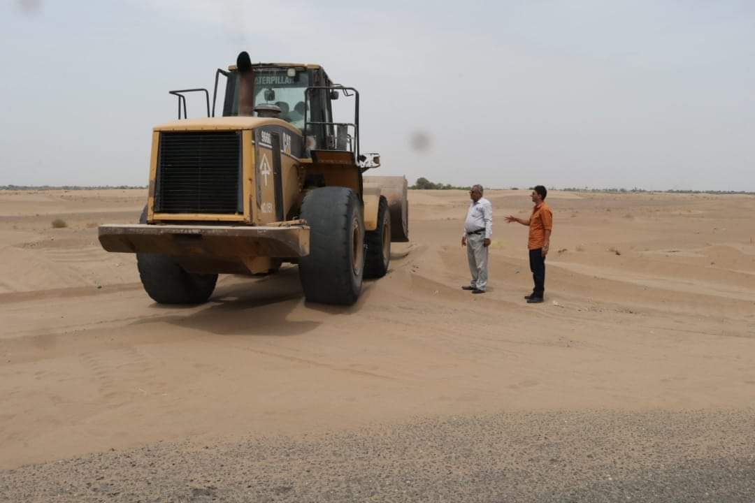 وتقوم الجهة المنفذة على إزاحة الرمال من الخط الرابط بين الحسيني والعلم بمحافظة أبين.