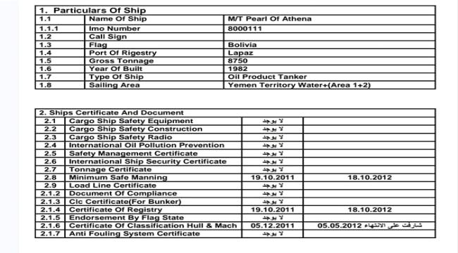 ونشر الناشط بسام القاضي تدوينة على حسابه في "فيسبوك" ذكر فيها ان وثائق وتقارير فحوصات - (ارفق واحدة منها خاصة بالناقلة لؤلؤة أثينا ) - صادرة عن الهيئة العامة للشؤون البحرية تفيد بأن هناك 12 سفينة متهالكة ومهددة بالغرق في سواحل عدن .