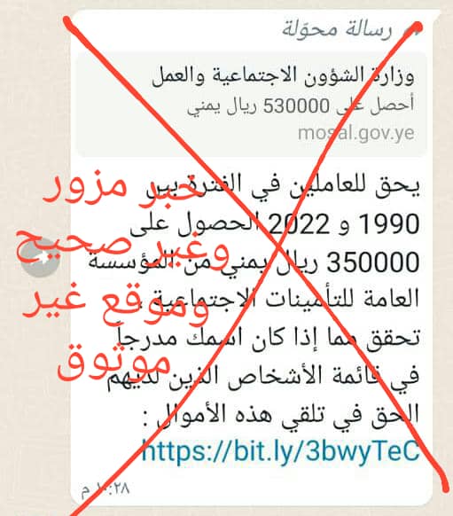 تنفي المؤسسة العامة للتأمينات الاجتماعية بالعاصمة عدن، مايتم تناوله عبر وسيلة التواصل الاجتماعي واتساب، مؤكدة بأنه لا صحة لصرف مبلغ مالي من قبل المؤسسة للعاملين دون أن يكون هناك استحقاق قانوني.