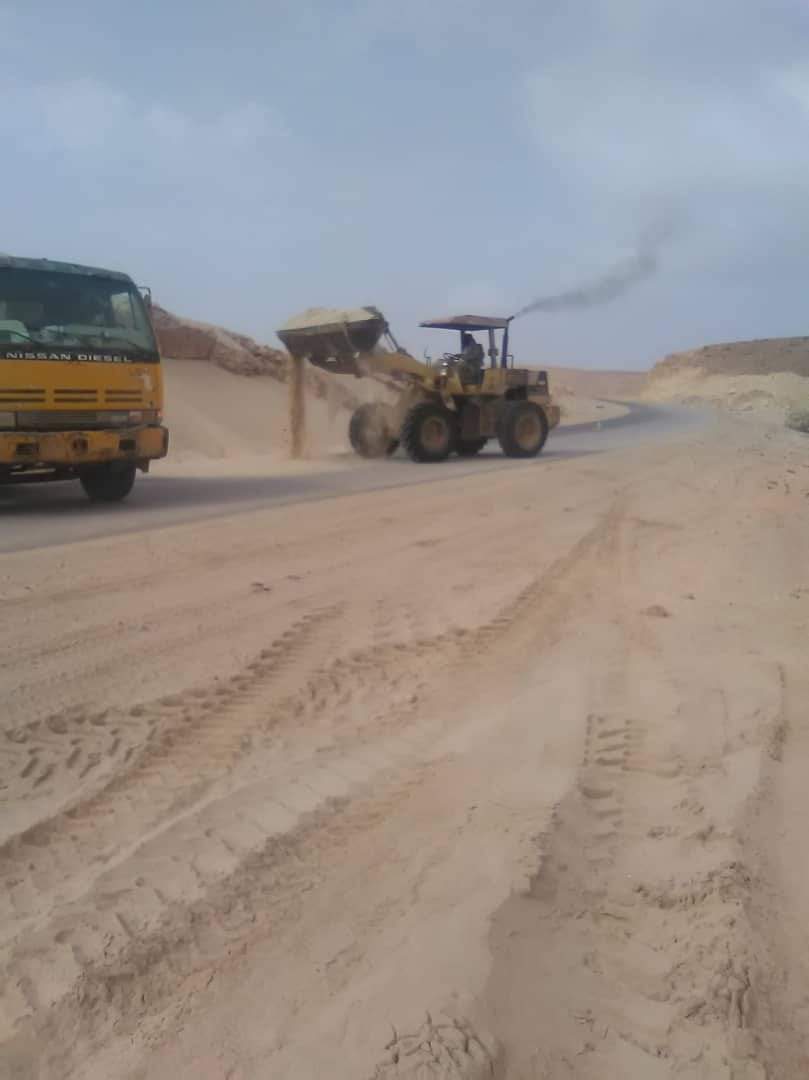 وجاء أعمال ازاحة الرمال تفادياً للحوادث المرورية التي تسببها زحف الرمال للخط الشرياني .