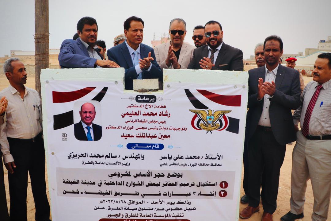 وضع وزير الأشغال العامة والطرق المهندس سالم محمد العبودي الحريزي، ومحافظ محافظة المهرة الأستاذ محمد علي ياسر، اليوم، حجر الأساس لمشروع استكمال ترميم حفريات لبعض الشوارع الداخلية لمدينة الغيضة، ومشروع إنشاء ثلاث عبارات لطريق الغيضة - شحن، بتمويل من صندوق صيانة الطرق، المركز الرئيسي عدن وتنفيذ المؤسسة العامة للطرق والجسور..