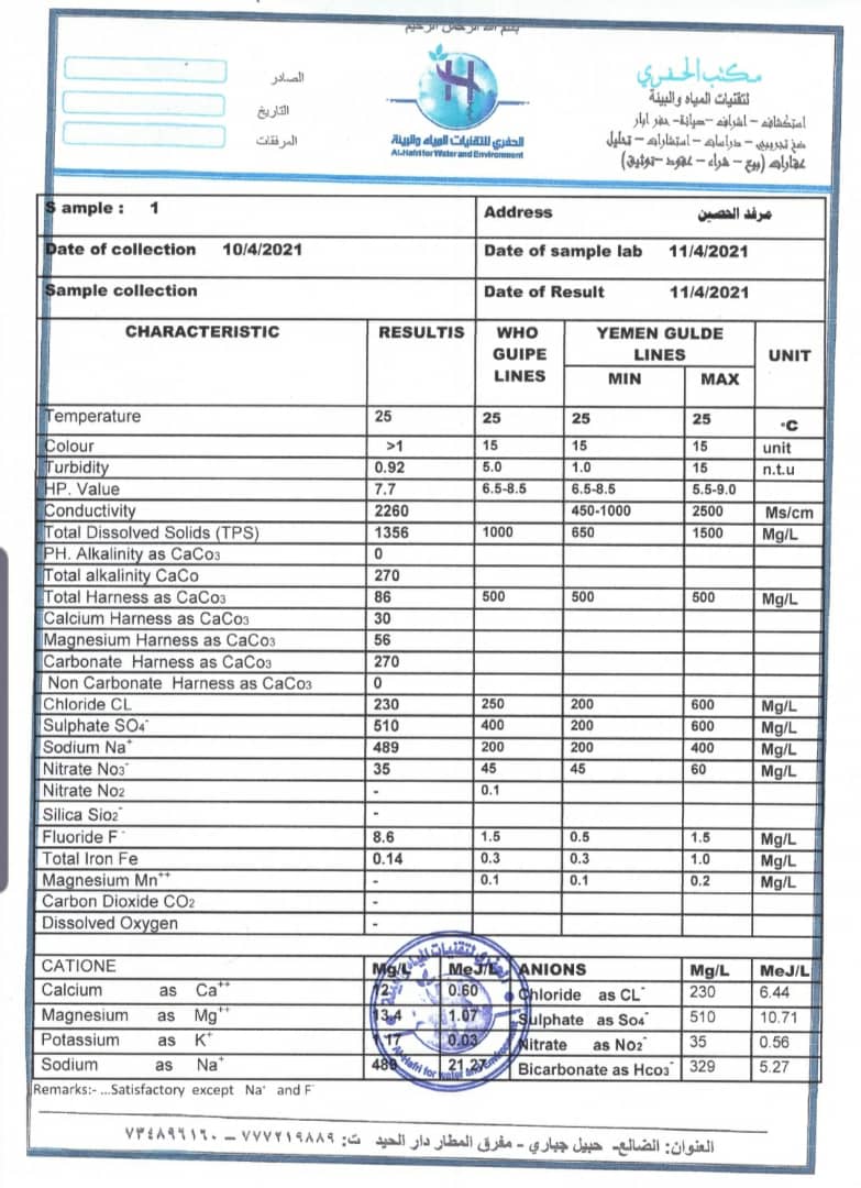 كما حصل مركز "سوث24" على نتائج فحص لعينات مياه من قرية مرفد، قال مواطنون إنَّها تمت بجهود مجتمعية خالصة في مختبرات بمدينة صنعاء، أظهرت نسب عالية من الفلورايد وصلت إلى 8.6 في النتيجة المخبرية.