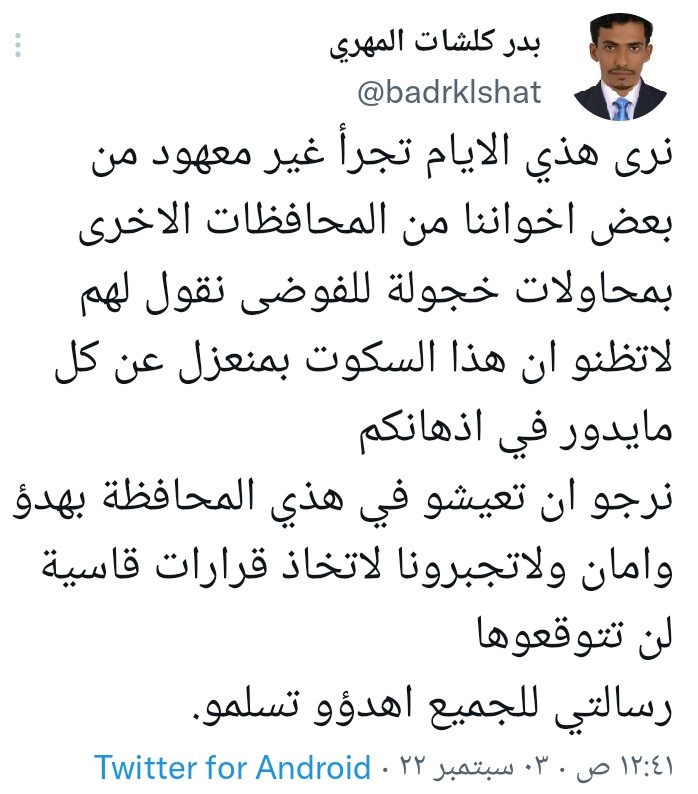 هدد الإخواني بدر كلشات وكيل محافظة المهرة لشؤون الشباب، من مقر إقامته في دولة عمان، بمواجهة وقتال أي قوات جنوبية تدخل المهرة.