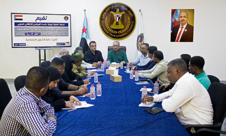 عقدت دائرة الشؤون الاجتماعية في الأمانة العامة لهيئة رئاسة المجلس الانتقالي الجنوبي، اليوم الثلاثاء، اللقاء التشاوري الثاني لمديري إدارات الشؤون الاجتماعية في الهيئات التنفيذية للقيادات المحلية للمجلس بمحافظات الجنوب، بحضور الأستاذ فضل محمد الجعدي، عضو هيئة الرئاسة، نائب الأمين العام.