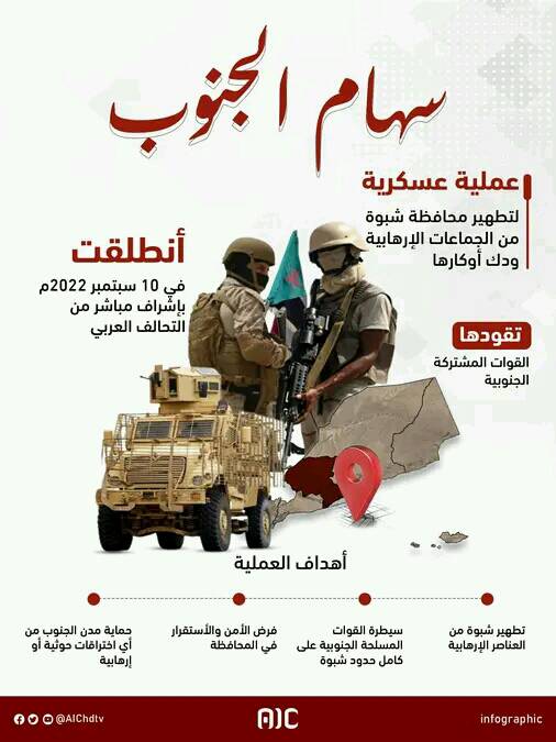 وقالت ”دفاع شبوة“ في سلسلة تغريدات عبر ”تويتر“ إن ”عملية سهام الجنوب، التي أعلنت عنها القوات الجنوبية المشتركة، تأتي بدعم من التحالف العربي“.