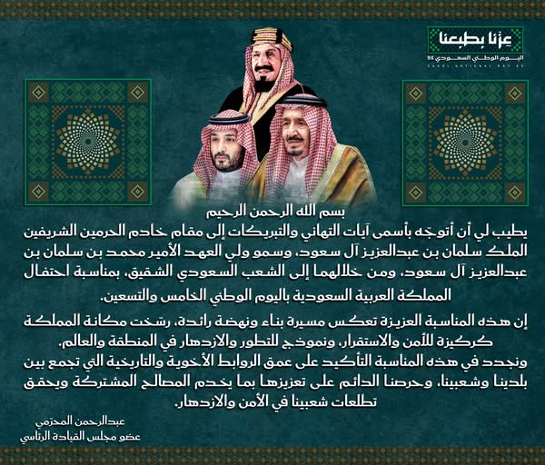 إن هذه المناسبة العزيزة تعكس مسيرة بناء ونهضة رائدة، رسّخت مكانة المملكة كركيزة للأمن والاستقرار، ونموذج للتطور والازدهار في المنطقة والعالم.