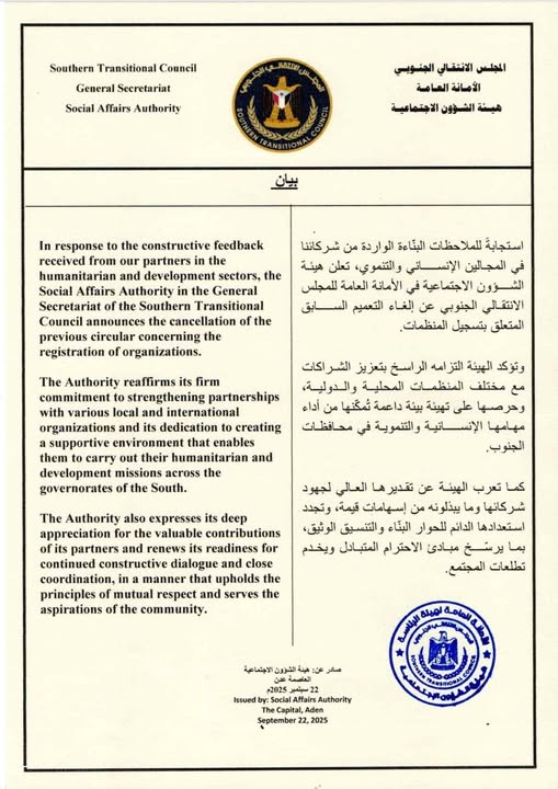 أعلنت هيئة الشؤون الاجتماعية في الأمانة العامة للمجلس الانتقالي الجنوبي عن إلغاء التعميم السابق المتعلق بتسجيل المنظمات، وذلك استجابةً للملاحظات البنّاءة التي تلقتها من شركاء العمل الإنساني والتنموي.
