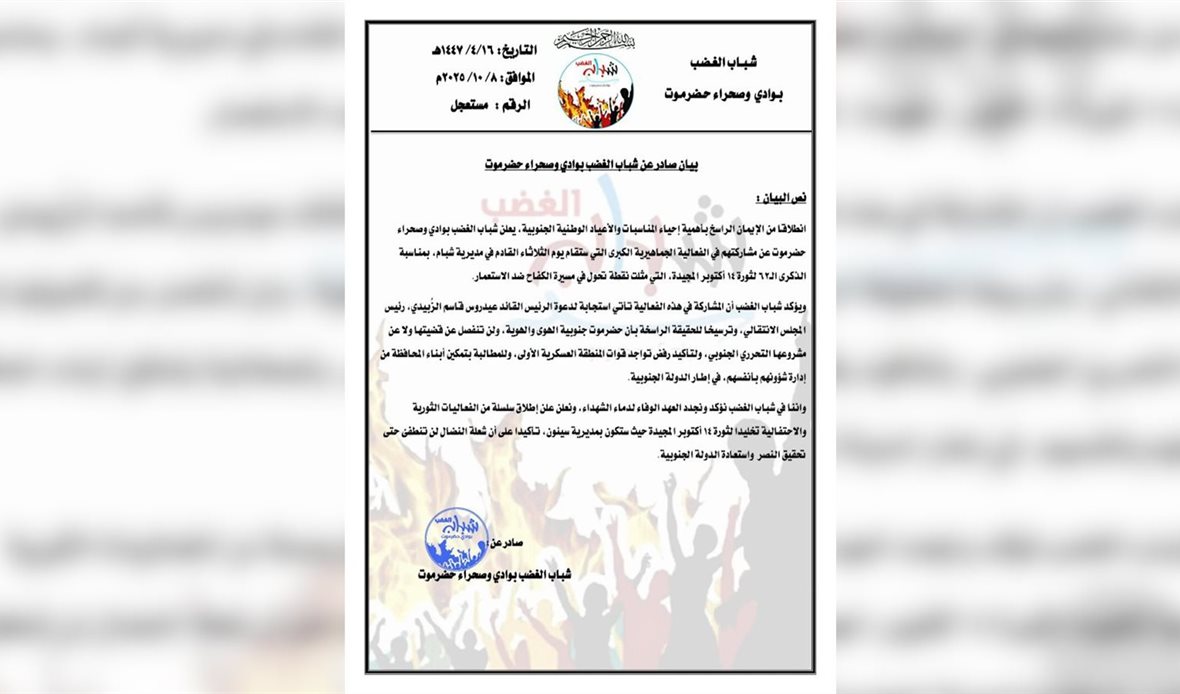 وأكد البيان الصادر عن شباب الغضب، أن مشاركتهم تأتي استجابة لدعوة الرئيس القائد عيدروس قاسم الزبيدي، وتجسيدًا لانتماء حضرموت الجنوبي، رافضًا لاستمرار وجود قوات المنطقة العسكرية الأولى، مطالبا بتمكين أبناء المحافظة من إدارة شؤونهم ضمن إطار الدولة الجنوبية المنشودة.
