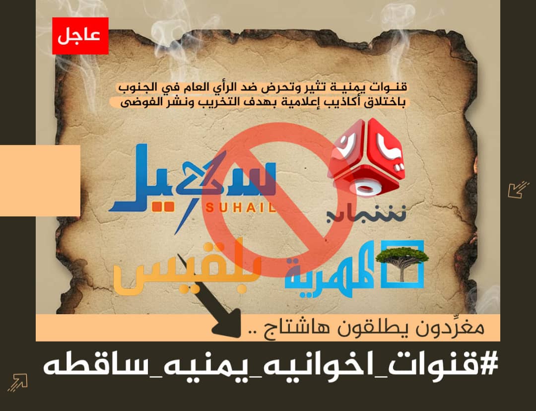 وطالبوا أبناء الجنوب بضرورة مقاطعة قنوات إخوان اليمن ( بلقيس وسهيل ويمن شباب والمهرية ) على جميع المنصات.