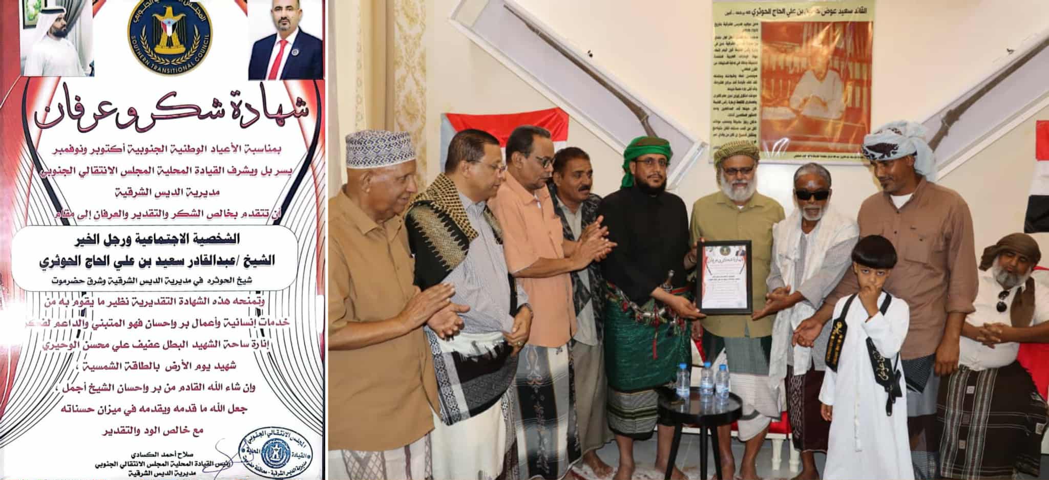 بمناسبة الأعياد الوطنية الجنوبية أكتوبر ونوفمبر وما يقدمه من خدمات إنسانية وأعمال بر وإحسان في المجتمع كرمت القيادة المحلية للمجلس الانتقالي الجنوبي بمديرية الديس الشرقية الشيخ عبدالقادر سعيد بن علي الحاج الحوثري (أبو حوثر)، شيخ قبيلة الحوثرة بمديرية الديس الشرقية وشرق حضرموت، بحضور وفود من قبائل يافع حضرموت الوادي وحضرموت والساحل والشخصيات الاجتماعية والقبلية بمديرية الديس الشرقية.