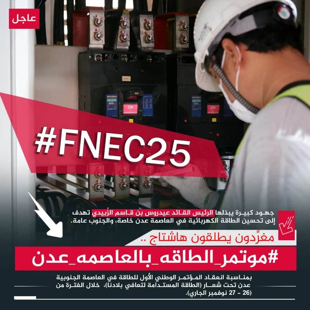 أطلق سياسيون ونشطاء عصر اليوم الأربعاء 26 نوفمبر / تشرين الثاني 2025م، وسم #موتمر_الطاقه_بالعاصمه_عدن ، وكذا وسم #FNEC25 على منصات التواصل الاجتماعي