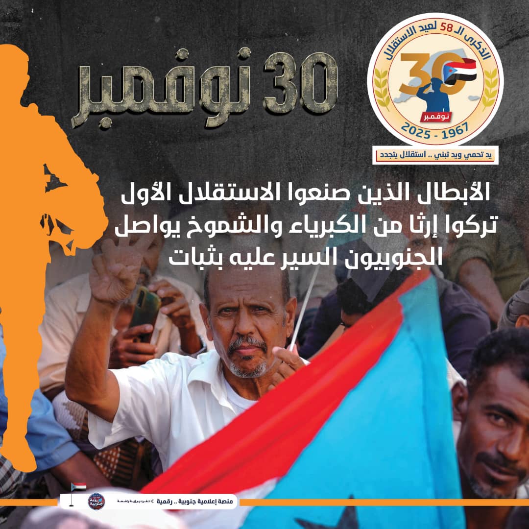 شهد عصر يومنا هذا السبت الموافق 29 نوفمبر / تشرين الثاني 2025م، انطلاق حملة إلكترونية وإعلامية واسعة النطاق تحت وسم #نوفمبر_استقلال_الجنوب_يتجدد، بتدشين من ناشطين إعلاميين وسياسيين جنوبيين، وتأتي هذه الحملة تزامنا مع حلول الذكرى الثامنة والخمسين لعيد الاستقلال الوطني المجيد، الـ (30) من نوفمبر، بهدف حشد أبناء شعب الجنوب العربي للاحتفاء بهذه الذكرى العظيمة وتجديد الثقة والموقف خلف القيادة السياسية.
