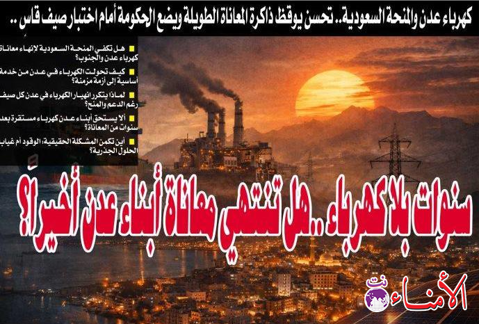 لسنوات طويلة، عاش أبناء عدن ولحج وأبين والضالع على وقع الانقطاعات المتواصلة للكهرباء، خصوصاً خلال مواسم الصيف اللاهبة، حيث تتحول المنازل إلى أفران مغلقة، وتتعطل المستشفيات، وتتوقف المصالح، وتتضاعف معاناة كبار السن والأطفال والمرضى.