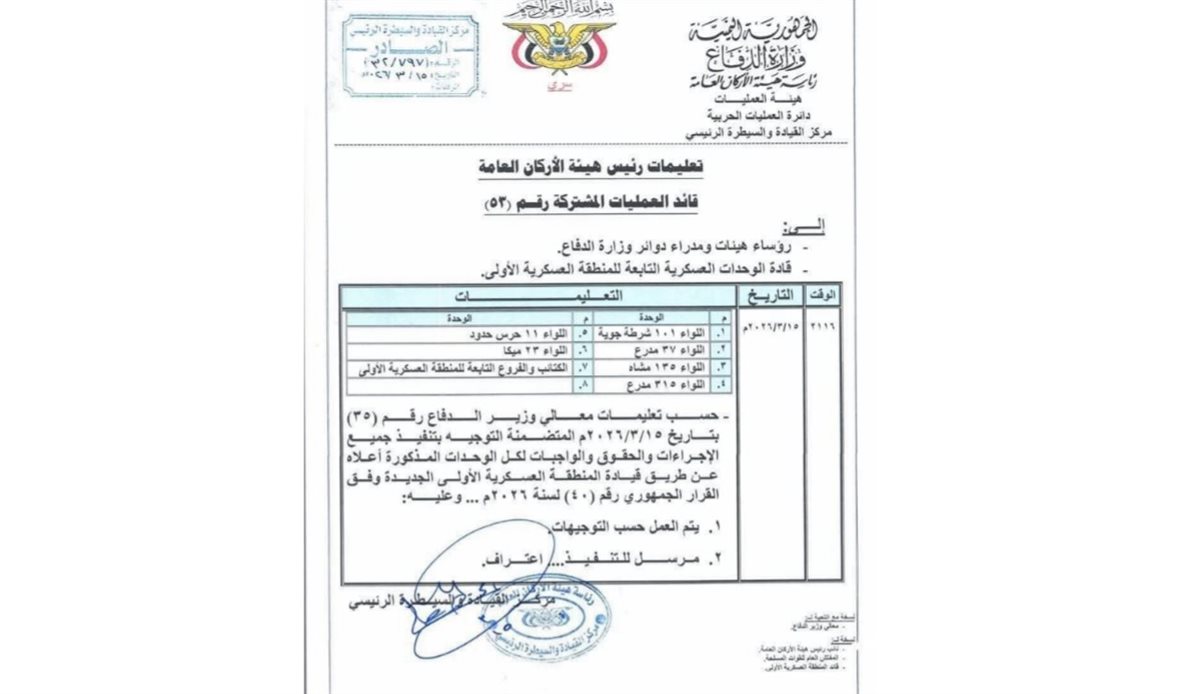 كشفت وثيقة مسربة جرى تداولها واسعاً عن صدور أوامر عسكرية من المدعو "طاهر العقيلي"، تقضي بإعادة القوات والقادة الشماليين التابعين للمنطقة العسكرية الأولى إلى مواقعهم في وادي وصحراء حضرموت.
