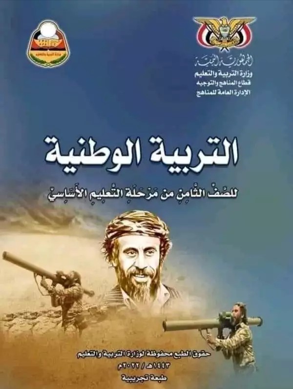 ونشر وزير الإعلام والثقافة والسياحة معمر الإرياني، ومنظمة "ميون" على حسابيهما في تويتر صورة متداولة لغلاف "تجريبي" خاص بمادة التربية الوطنية للصف الثامن من التعليم الأساسي.