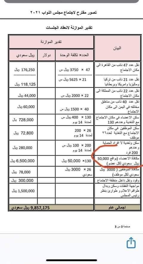 وبحسب الوثيقة فإن رئاسة مجلس النواب قد حددت موازنة تقديرية لعقد جلسات لمجلس النواب في الداخل بتكلفة تصل الى نحو 10 مليون ريال سعودي أي ما يعادل 3 مليار ونص المليار ريال يمني.