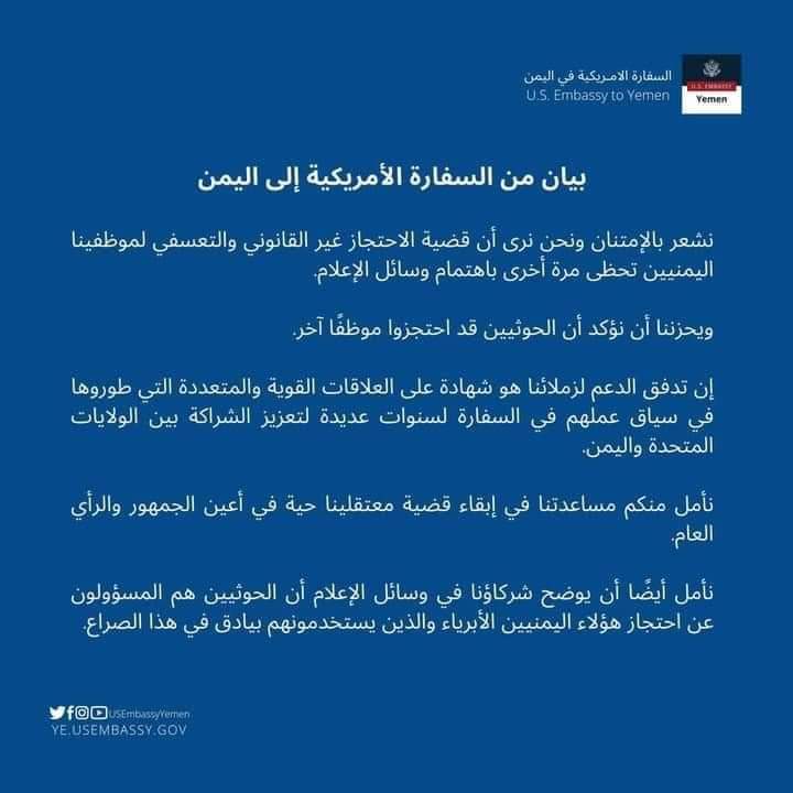 وقالت بعثة واشنطن لدى اليمن في تغريدة لها على تويتر إنها “تؤكد أن الحوثيين احتجزوا موظف أخر”، عندما داهموا منزل “عبدالرحمن سيف الشرعبي” مساعد مدير الملحق الإعلامي بالسفارة الأمريكية بصنعاء، واقتادوه إلى منطقة مجهولة.