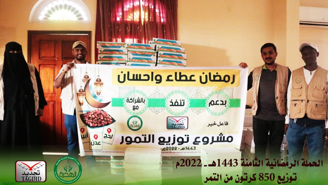 وزّعت مؤسسة الهجرة الخيرية التنموية 850 كرتون من التمور، ضمن أعمال الحملة الرمضانية الثامنة (رمضان عطاء وإحسان) لهذا العام 1443هـ - 2022م، حيث نفذت مؤسسة الهجرة الخيرية للتنمية بالعاصمة عدن عملية التوزيع، بمساهمة وشراكة العديد من رجال الخير الأوفياء ومنظمات المجتمع المدني الخيرية وغيرها من داخل اليمن وخارجه.