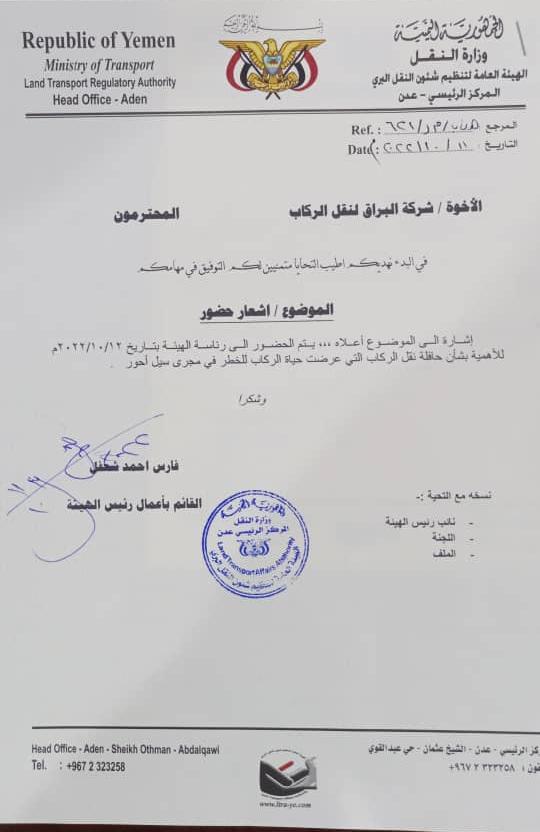 وجاء في إشعار ارسلته الهيئة للشركة: الأخوة شركة البراق لنقل الركاب يتم الحضور إلى رئاسة الهيئة بتاريخ 12 اكتوبر الجاري للأهمية، وذلك بشأن حافلة نقل الركاب التي عرضت حياة الركاب للخطر في مجرى سيل أحور.