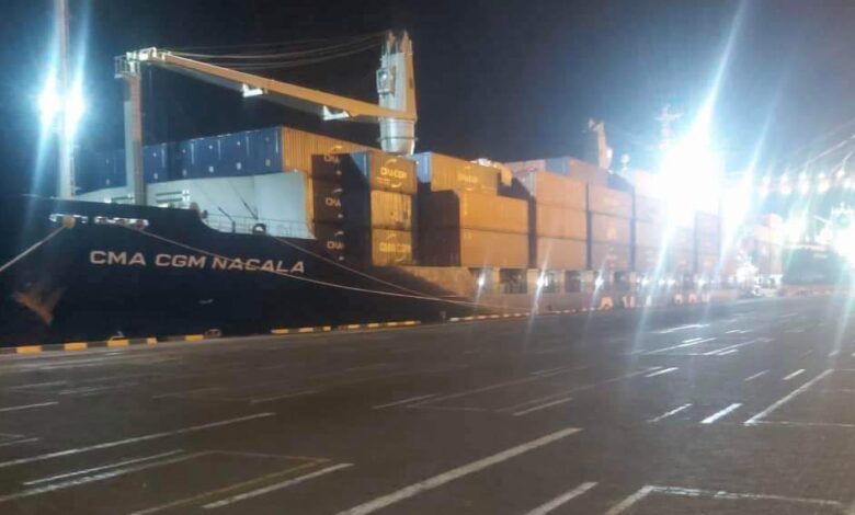 رست اليوم الباخرة CMA CGM NACALA في محطة عدن للحاويات في أول زيارة لها للمحطة حاملة على متنها المئات من الحاويات لتغطية إحتياجات السوق المحلية من البضائع المختلفة.
