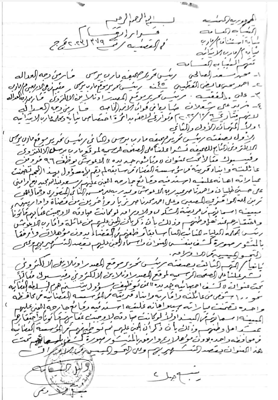 وجاء في قرار الاتهام أن المتهمين قد أخلوا بشرف مهنة الصحافة ونشروا كشفاَ باسماء قضاة واداريين خلافا للحقيقة وإخلالا بواجباتهم الصحفية والتي تفرض عليهم الحصول على المعلومات الصحيحة من مصادر موثوقة ونقلها للجمهور نقلا صادقا وأمينا دون تشوية وتزوير.