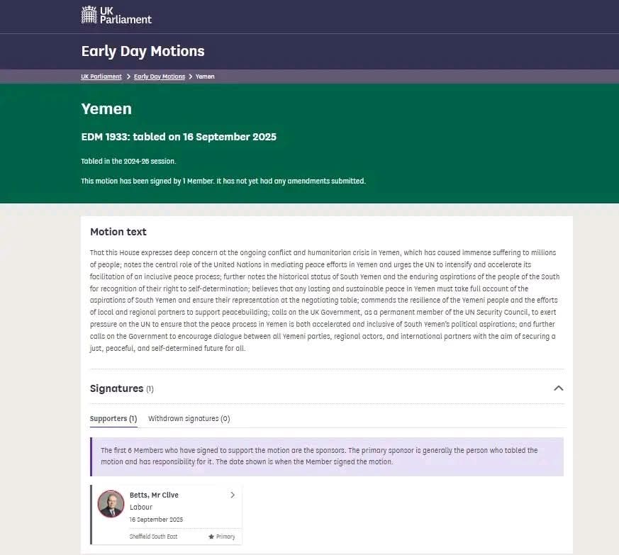 البرلمان البريطاني يصدر رسمياً "مذكرة" قرار دعم لقضية الجنوب