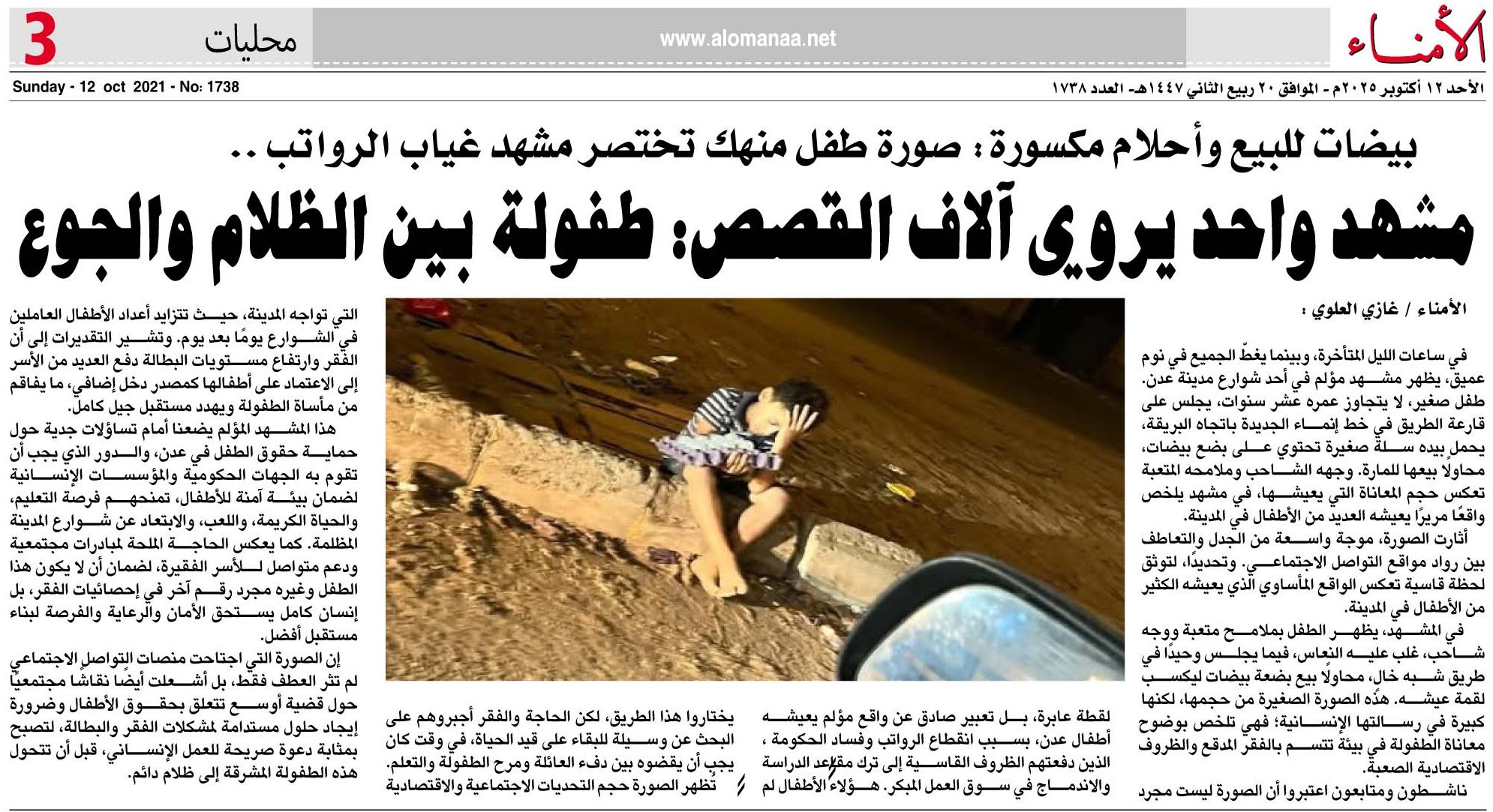 هذا المشهد المؤلم يضعنا أمام تساؤلات جدية حول حماية حقوق الطفل في عدن، والدور الذي يجب أن تقوم به الجهات الحكومية والمؤسسات الإنسانية لضمان بيئة آمنة للأطفال، تمنحهم فرصة التعليم، والحياة الكريمة، واللعب، والابتعاد عن شوارع المدينة المظلمة. كما يعكس الحاجة الملحة لمبادرات مجتمعية ودعم متواصل للأسر الفقيرة، لضمان أن لا يكون هذا الطفل وغيره مجرد رقم آخر في إحصائيات الفقر، بل إنسان كامل يستحق الأمان والرعاية والفرصة لبناء مستقبل أفضل.