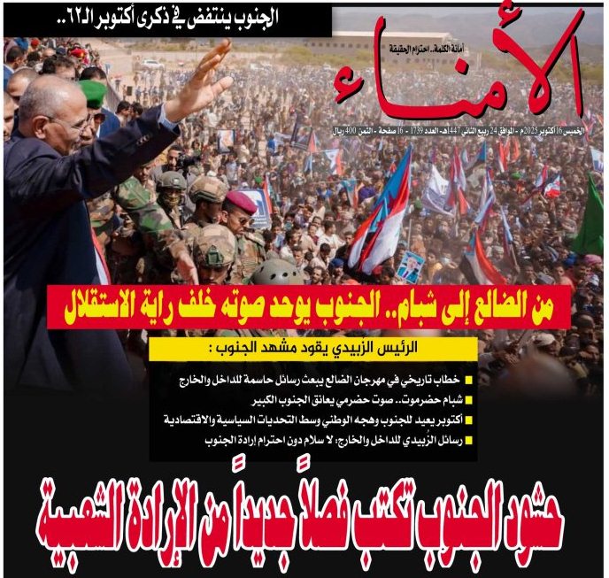 احتشدت عشرات الآلاف من أبناء الجنوب في ميادين الضالع وشبام حضرموت، استجابةً لدعوة الرئيس القائد عيدروس قاسم الزُبيدي رئيس المجلس الانتقالي الجنوبي، لتجديد العهد والوفاء لتضحيات الأبطال الذين صنعوا فجر أكتوبر المجيد.