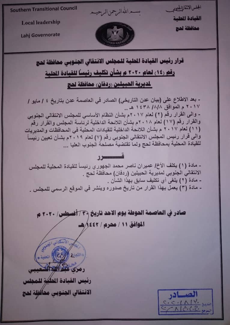 كما أصدر رئيس القيادة المحلية لانتقالي لحج القرار رقم "15" للعام 2020م قضت المادة الأولى بتكليف الأخ / فيصل محمد عمر سيف مستشارا لرئيس القيادة المحلية محافظة لحج لشؤون مديرية الحبيلين ردفان ويرفّع إلى عضوية المحافظة .